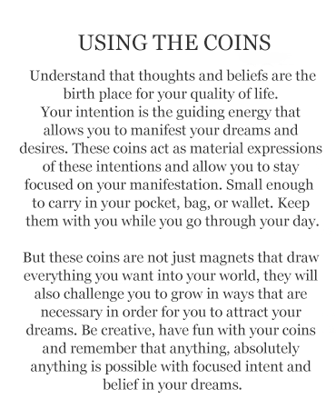 May the intention coins and their meditations on abundance, health, love and spirituality, propel you into the life you’ve always dreamed of, powered by vision, passion and faith.